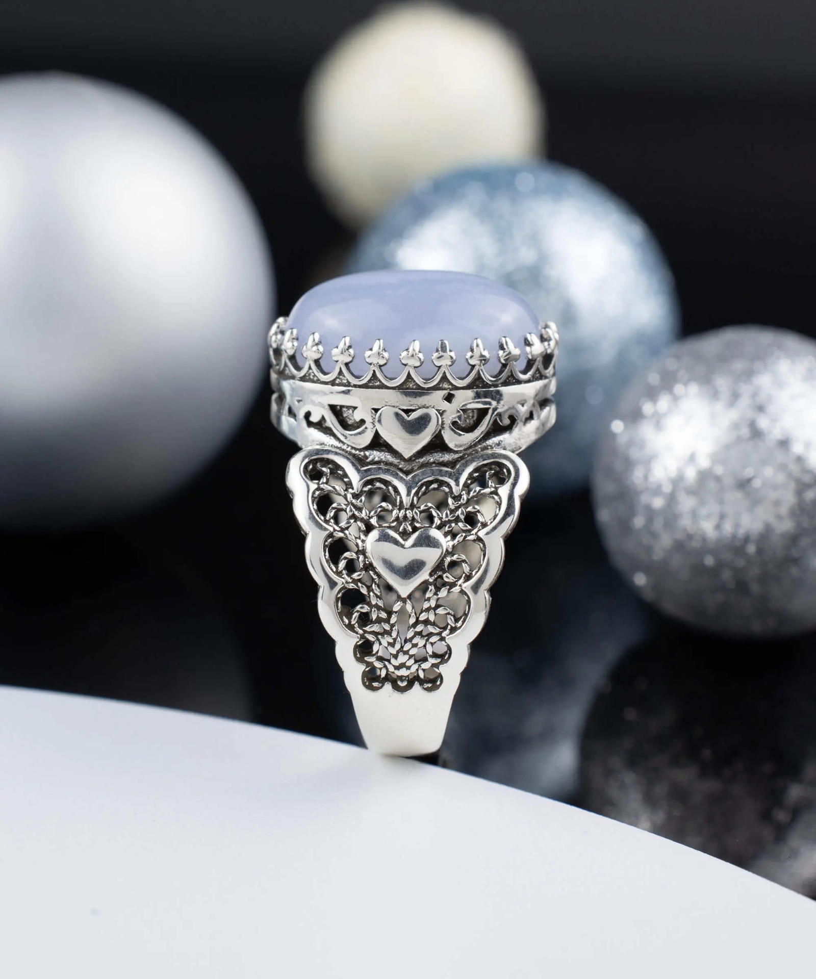 Celebrate the new year in style with Filigranist's 925 sterling silver filigree art double heart detailed cocktail ring! This stunning ring allows you to express your individuality and sense of style while making a statement that is sure to turn heads. Crafted with precision from high-quality 925 sterling silver, this ring features beautiful blue lace agate gemstone decoration and is stamped with the brand logo.