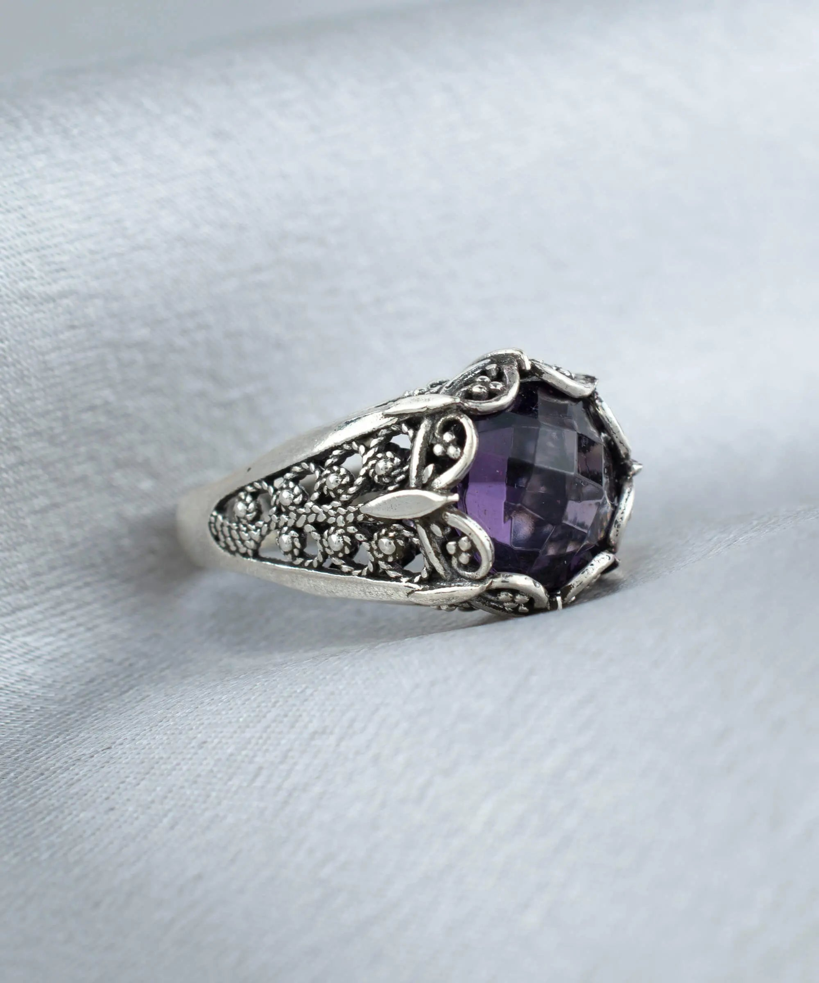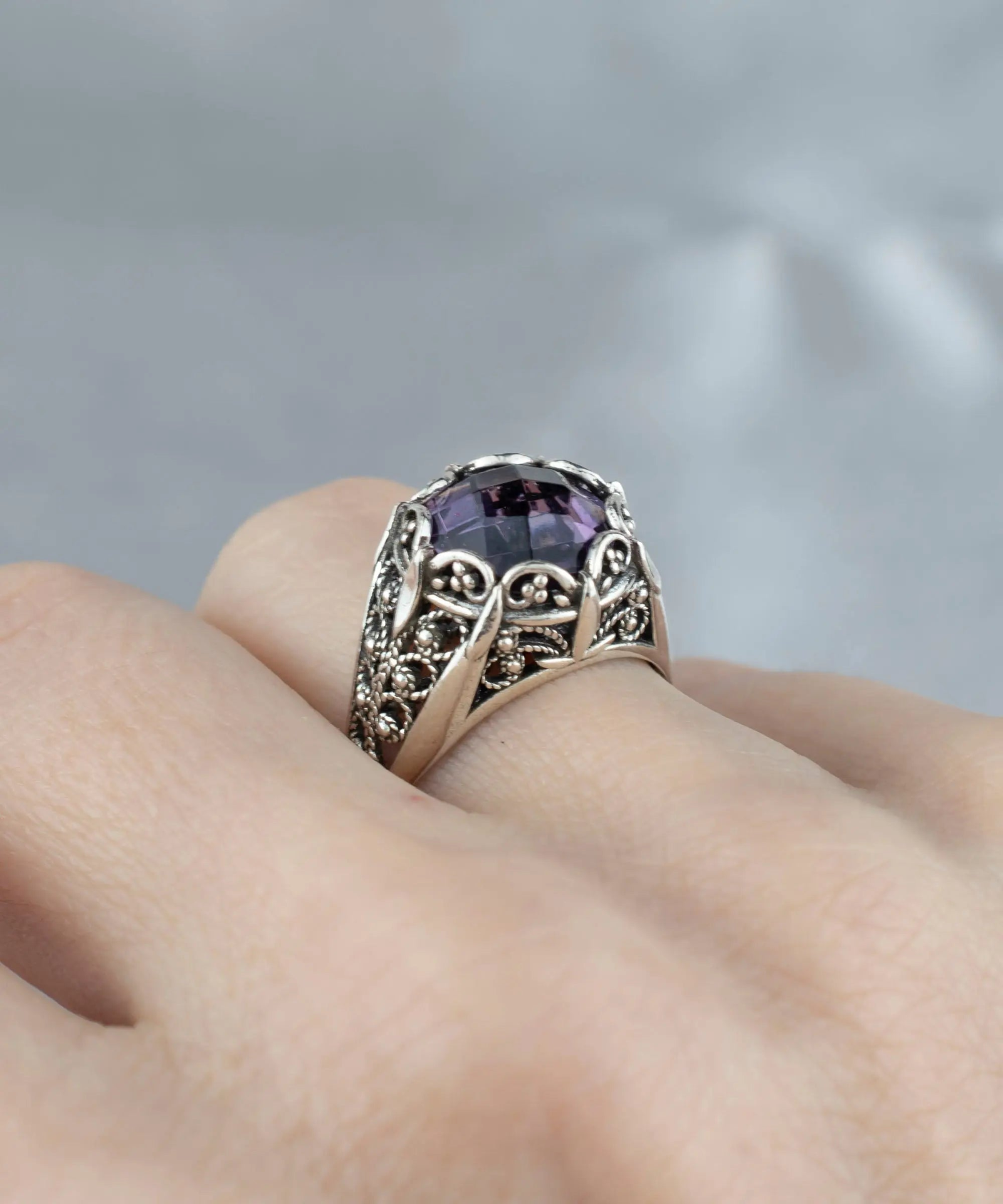 Add a touch of luxury to your everyday look with this intricately designed 925 sterling silver cocktail ring. Featuring a 10mm double side faceted, checkerboard-cut February birthstone amethyst gemstone and exquisite filigree art embroidery, this versatile and stylish piece is a classic accessory that's perfect for any occasion.