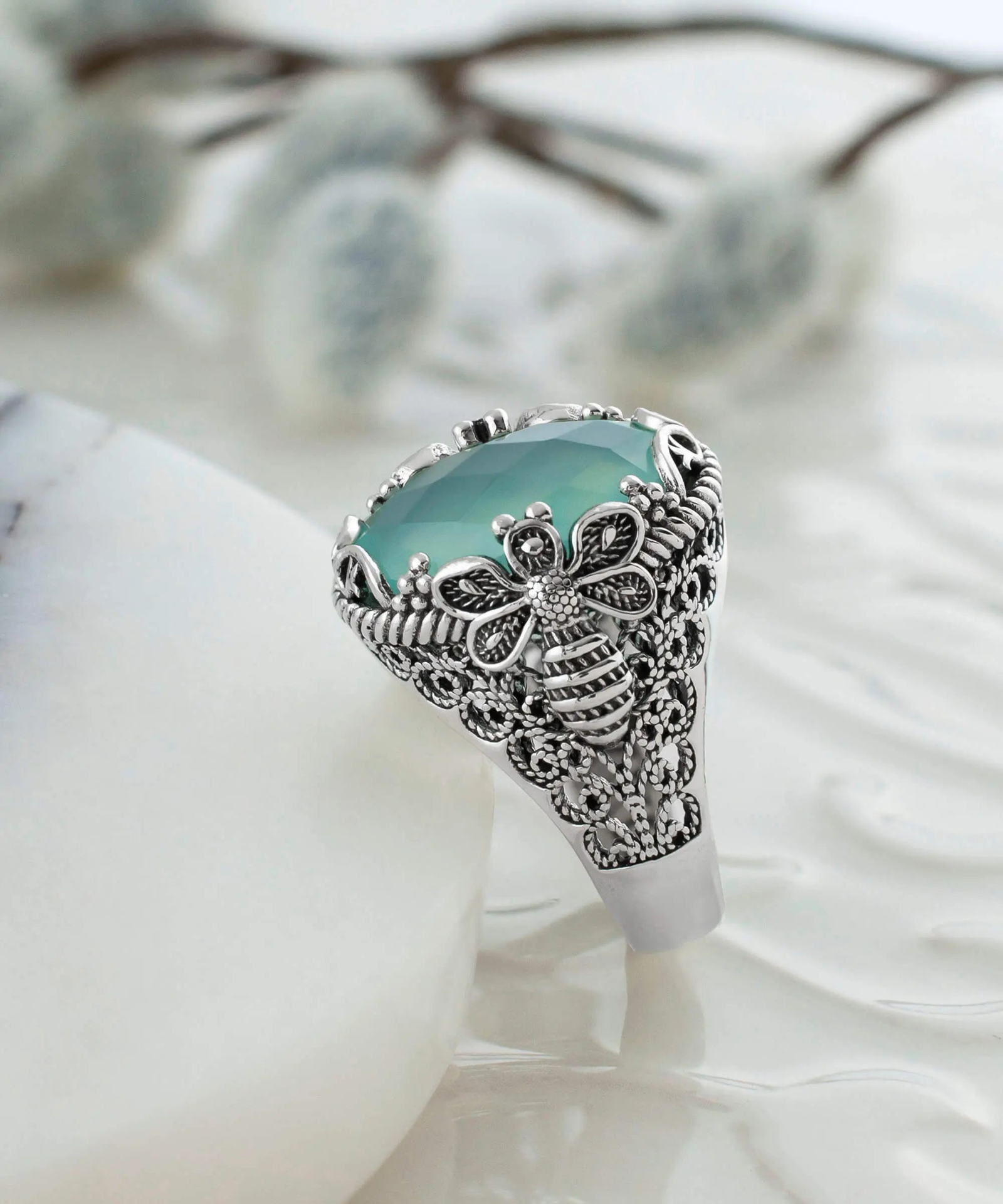 Filigree Art Bee Detailed Aqua Chalcedony Gemstone Women Silver Statement Ring