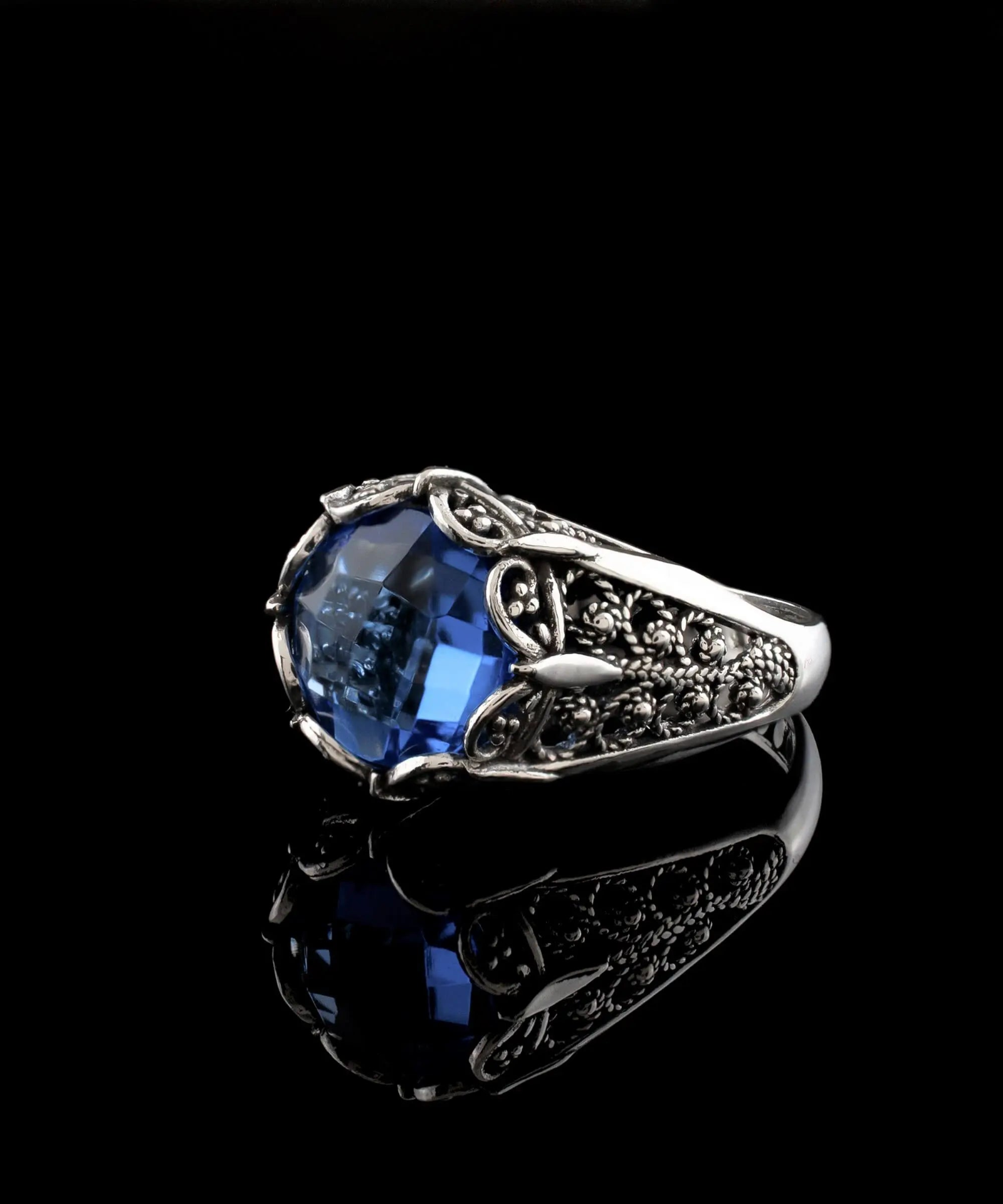 Introducing the Filigranist 925 Sterling Silver Women's Ring with Blue Quartz Gemstone - the perfect accessory for any occasion. This cocktail ring features a stunning blue quartz gemstone, double side faceted with a checkerboard round-cut. The stone is set in a beautifully crafted sterling silver filigree setting that is both oxidized and highly polished.